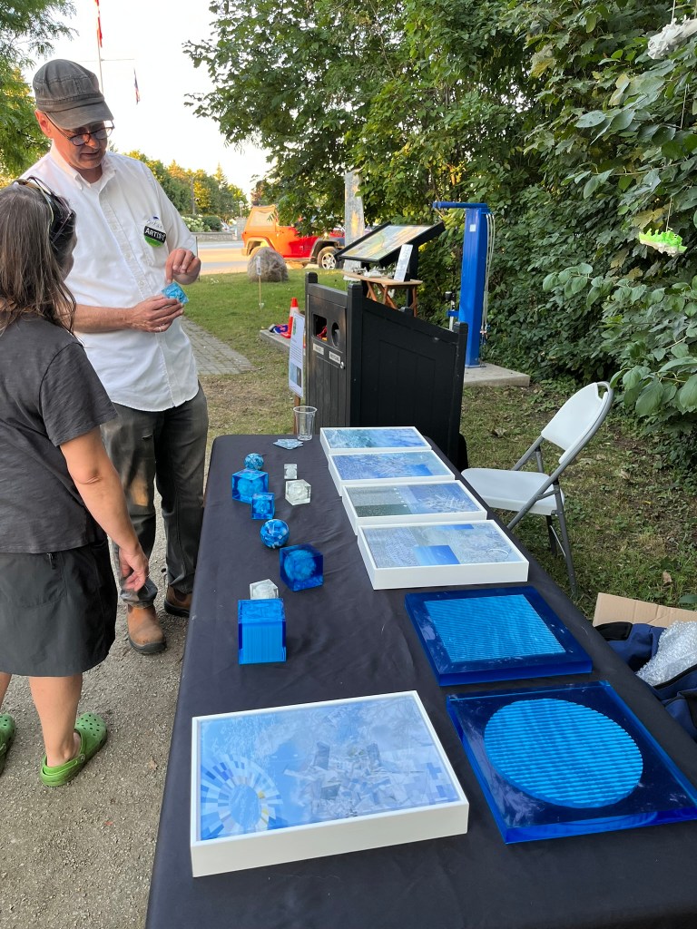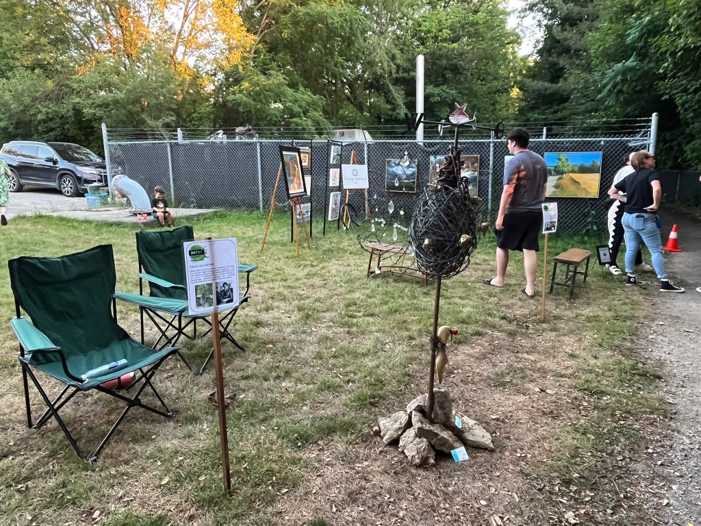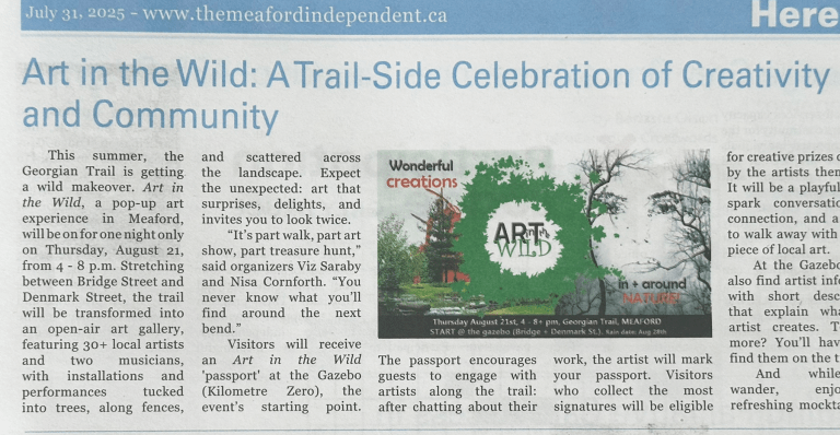 In the Summer of 2025, Viz Saraby, Mikael Sandblom and Nisa Cornforth initiated the Art in the Wild show in Meaford. It began as a celebration of curiosity, creativity, and community, a one-evening event when the familiar Georgian Trail was transformed into an open‑air gallery. More than 30 local artists and two musicians scattered work through trees, along fences, and across the landscape, turning nature itself into exhibition space. Visitors wandered the trail with drink in hand, discovering installations tucked into unexpected corners, and chatted with the artists. It invited people to look twice at both art and its environment.